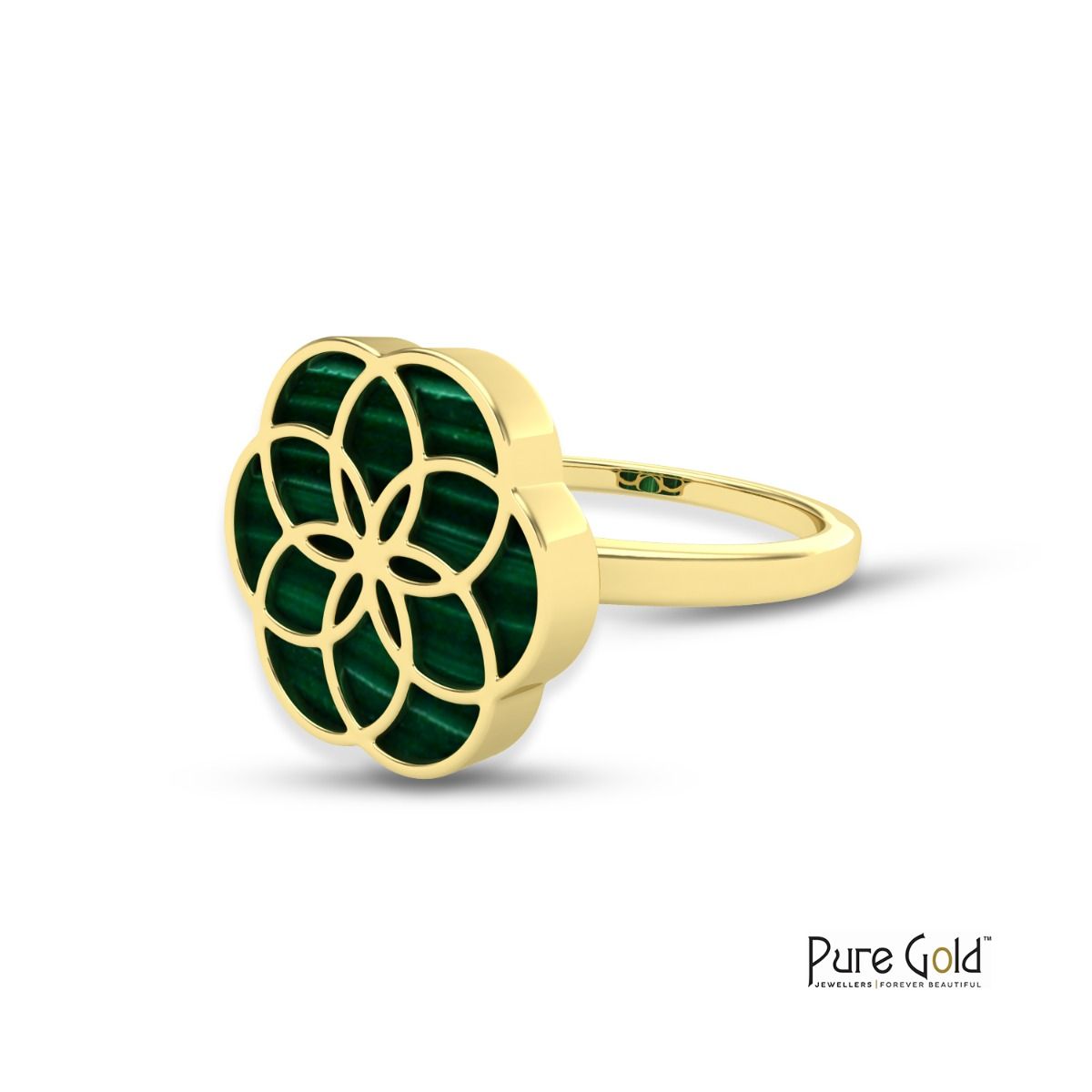 Indulge in the beauty of the 18 Karat Gold Luciana Malachite Ring. This exquisite piece features a stunning 3.85CTS malachite stone, intricately carved into a flower shape. The ring is crafted from 3.45 grams of 18 karat gold, ensuring both beauty and durability. The Luciana Malachite Ring is a perfect way to add a touch of luxury to any outfit. Whether you're looking for a special gift for yourself or a loved one, the Luciana Malachite Ring is sure to impress.
