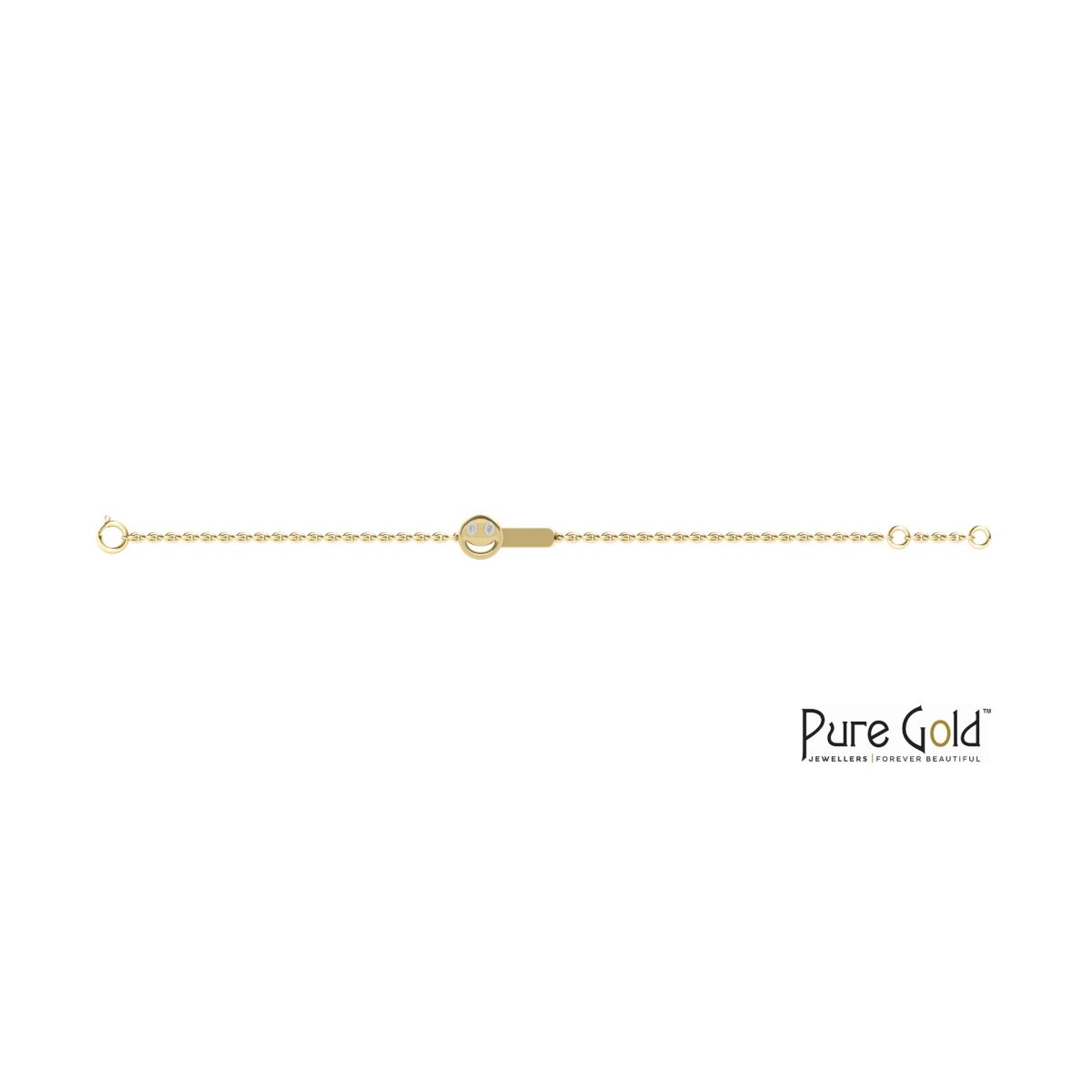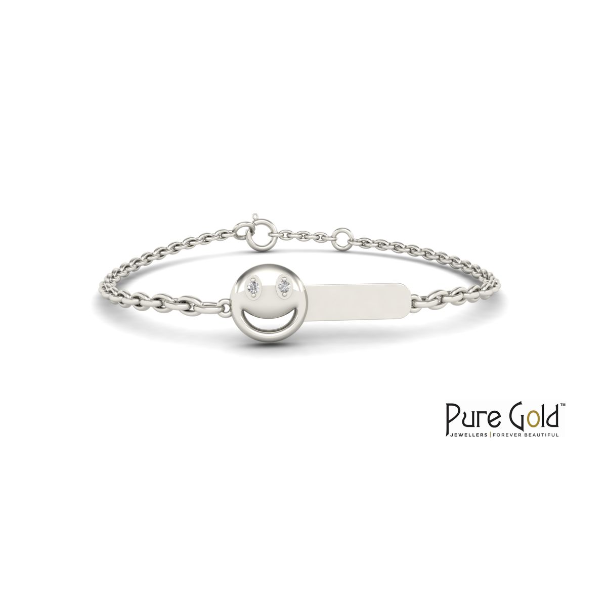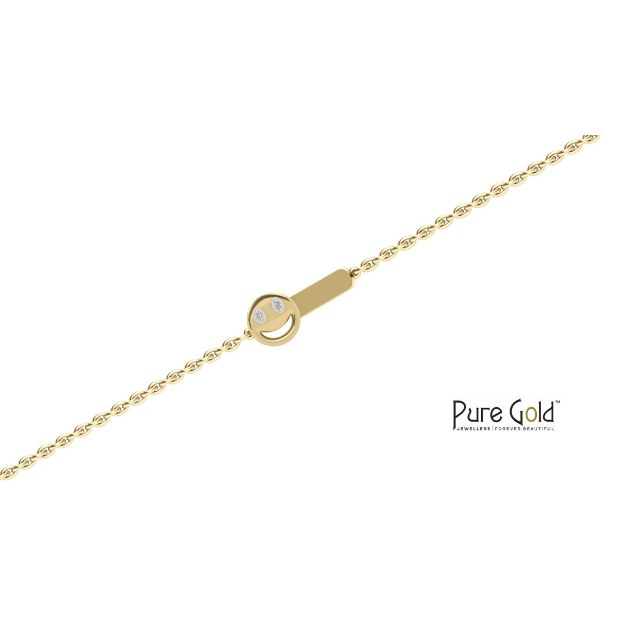 Shine bright like a Smiley Sunshine Bracelet! This adorable 18k yellow gold chain features a charming smiley face embellished with a sparkling 0.02CTS diamond. Perfect for a child's first piece of jewelry, this bracelet is sure to bring a smile to their face. For an extra special touch, have it engraved with their initials or a special message. They'll love wearing a piece that reflects their sunny personality!