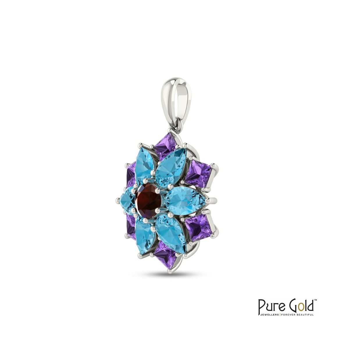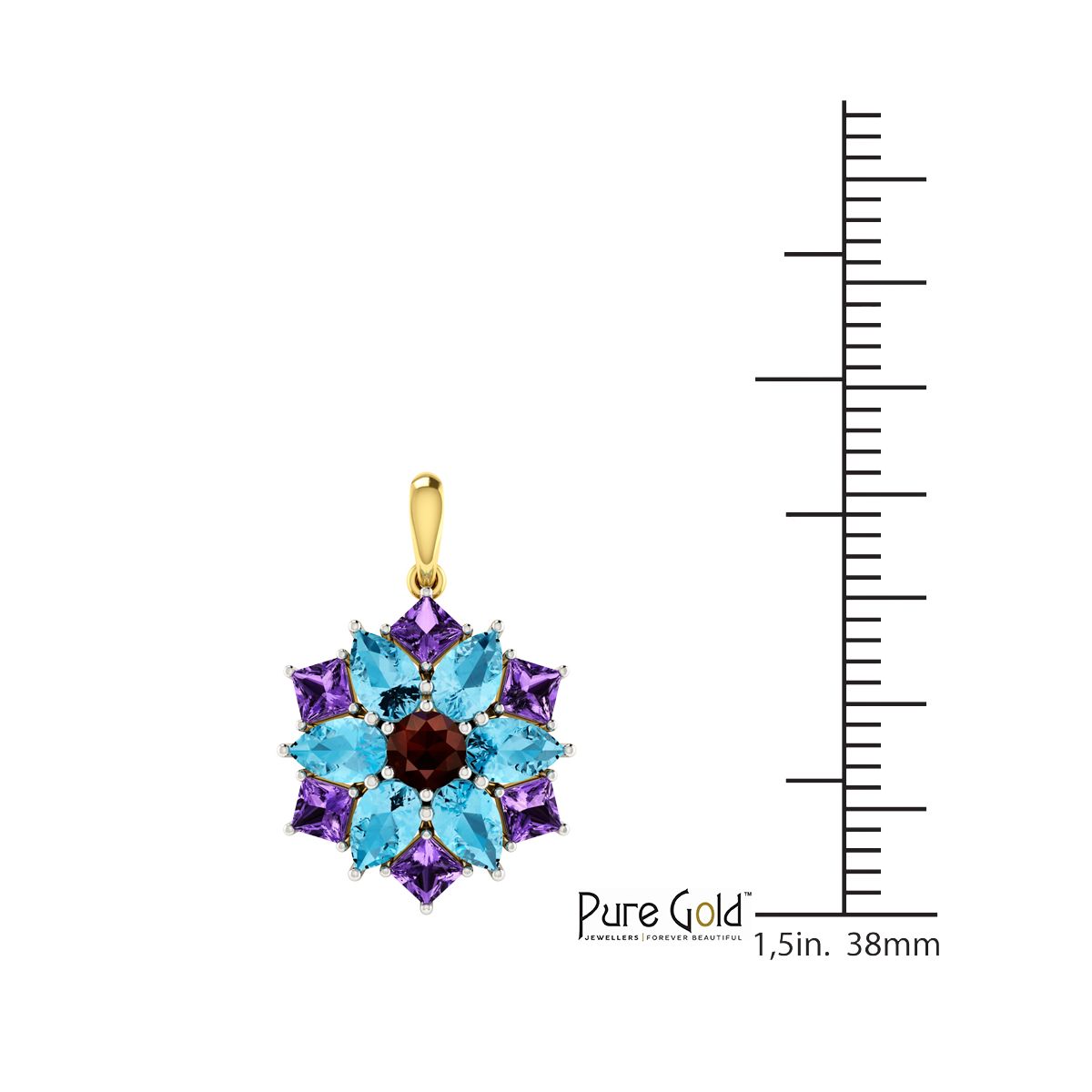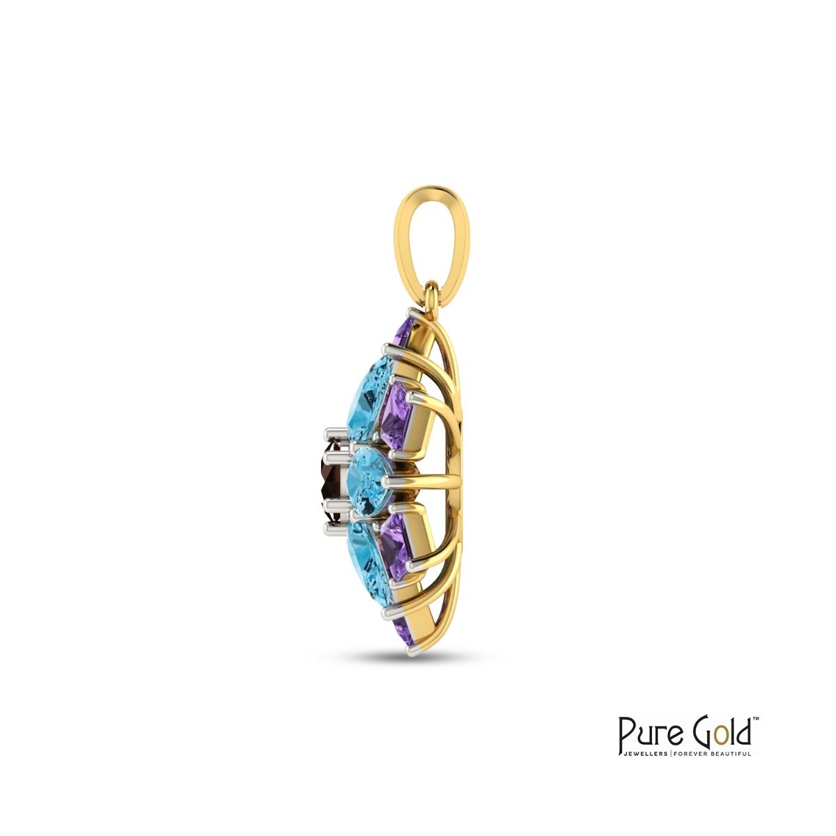 Crafted with 2.4 grams of exquisite Amethyst Pear, Blue-topaz, and Garnet Pear stones, and complemented by 2.05 grams of radiant 18K gold, this pendant is a true masterpiece. The vibrant colors and intricate design create a mesmerizing floral motif, making it a perfect accessory for any occasion. Elevate your jewelry collection with this timeless pendant, a symbol of beauty and grace that is sure to captivate and enchant.